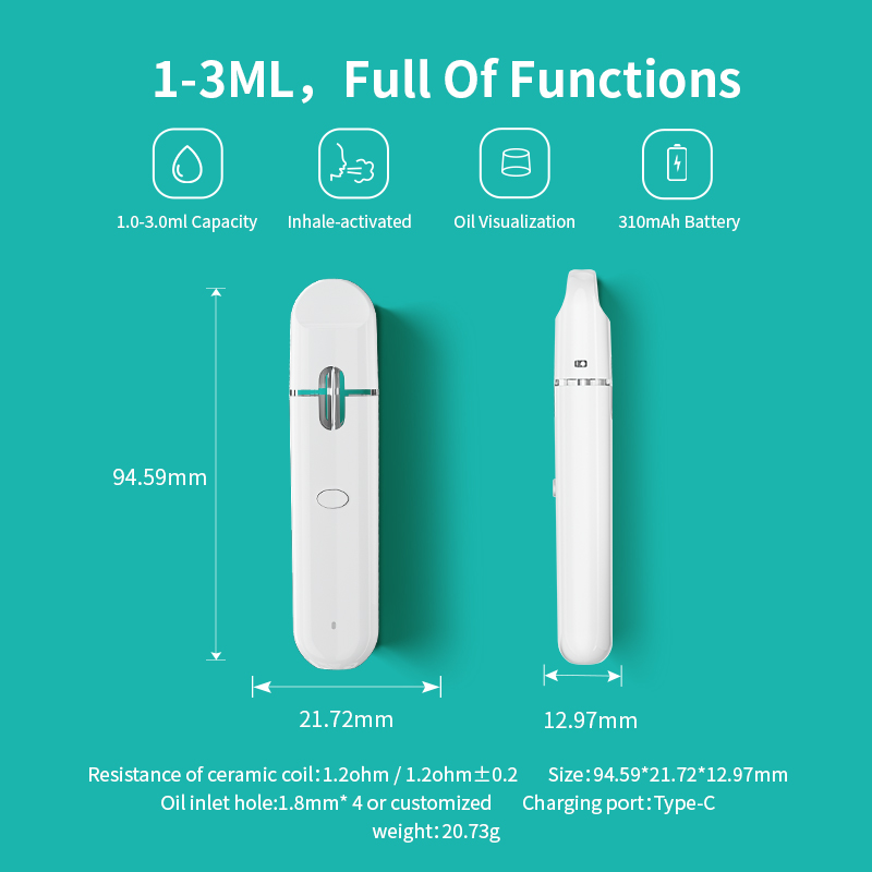 ● 1-3ml capacity, 310mah battery, center rod made of 316L stainless steel, very safe.